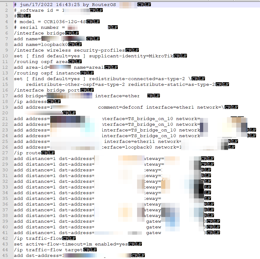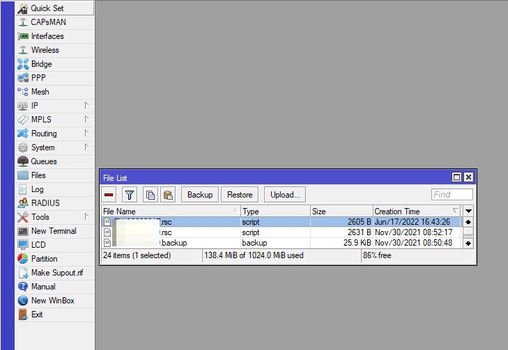 Backup RouterOS@MikroTik by WinBox Jun 20, 2022 1 min read Best way for backup your settings:Login to WinBox, open Terminal Key in: export file=XXXXXXXX.rsc XXXXXXX is file name as you likeFile> you can mouse right-click on XXXX.rsc to download file, rsc can open by text editor such as Notepad++ and NotepadIf you change the new RouterOS device, just edit some code and paste to new device, Easy. David Yuen More posts Hong Kong